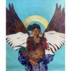 Mother Mah, Goddess of Creations is inspired by Indaba, My Children by Credo Mutwa. She is seated bearing the dignity of the Nokhubulwane. The Zulu Great mother who brings fertility, creation and wisdom. Her Herero style head - wrap roots her in African identity. A cow’s head rests on her shoulder (cattles are a wealth and a sacredness). A double-bringing earth and sky, mortality and myth. Together these works question: what is belief when holiness walks among us? What becomes of myth when divine returns?