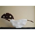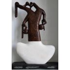 Ndudzo's delicately carved forms typically explore and celebrate the female form, in both elegantly carved lines and swooping curves. His inspiration is often based on his wife and daughters, but he also explores interpersonal relationships, as well as more universal issues, such as the unfolding tragedy of migrants leaving their countries. Carved from ironwood, the hardest known, slow-growing wood on the African continent, Ndudzo's combines the beautifully honed wood with gleaming marble into forms that illicit a feeling of softness and femininity, despite the materials. He transforms this ancient wood into powerful and romantic imagery, defying the weight and density of the material.